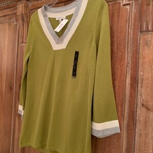 Stylish, silky soft V-neck sweater with grey and cream color ribbed trim on collar and sleeve cuffs.