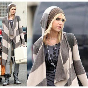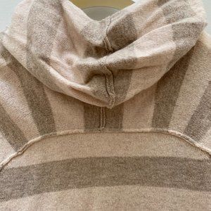 Softly structured, this long cardigan sweater uses a beautiful stitching detail to deliver an effortlessly elegant look that's especially polished. Reach for it on cold days when a little mood-lift is just the thing. Thick tan and cream stripes. Relaxed fit. Interior ties to keep it wrapped around if that's your thing. Good used condition but it's starting to pill a little bit and the price reflects that. Hooded. Size medium.