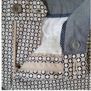 Banana Republic Hampton fit cuffed cropped pants in a tan, white & black geometric print with side slit pockets, faux back pockets, zip up and button closure. Very nice summer pants in excellent used condition with no flaws noted. Cotton/Spandex blend. Machine wash cold gentle cycle and tumble dry low heat setting. Size 6 Approximate laid flat measurements: Waist 16.25" , hips 18.5" front rise 9", back rise 13", Inseam 22", outseam 30.5".