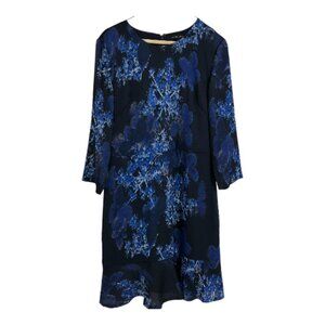 This Banana Republic dress is a black with blue abstract floral pattern. It has 3/4 length sleeves and a flounced hem. Body of dress is fully lined and it zips up the back. Wear this dress for a special occasion with a statement necklace, or to the office with a black or navy blue blazer over top.