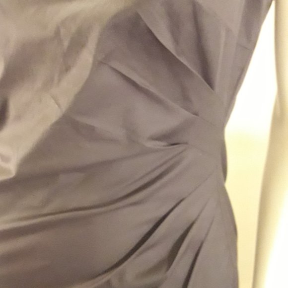 Knee length, scoop neckline and sleeveless. Centre back invisible zipper, side rouche and centre back kick pleat. Fully lined. cotton/spandex fabric