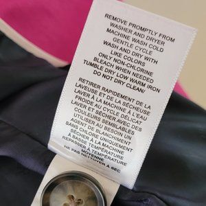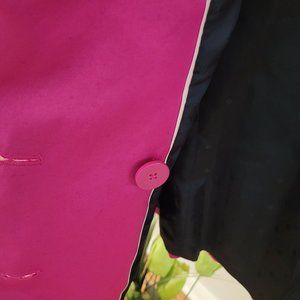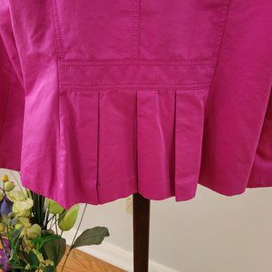 This beautiful twill cotton jacket in a bright pink/fuchsia colour is perfect for spring or fall! It is in very good pre-loved condition and features side pockets, back pleating and button closures. There is a very minor mark on the front bottom of the jacket just below the lowest buttons that only shows up in certain lights (I tried to take a picture of it, but it doesn't really show - in my opinion it is not noticeable as I have to search to find it every time!). This is reflected in the price. From a smoke free and pet free home.