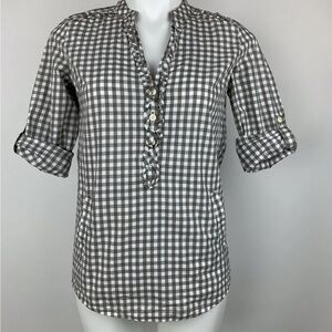 Banana Republic Mocha Brown & White Gingham Plaid Henley Ruffle Shirt.