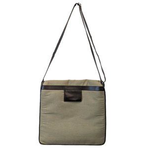 Banana Republic olive green messenger bag with dark brown leather piping and accents. Lining in orange and brown micro hounds tooth pattern. Zippered pocket on front fold-over flap. Large slip pocket on outer back with attached ID card holder. One large zippered pocket on inner lining. Adjustable shoulder strap.