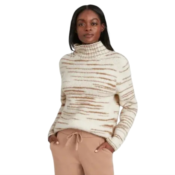 Chunky turtleneck sweater in a cream/camel spacedye color combo. Boxy, slightly oversized fit.