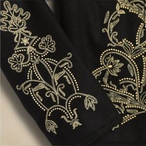 • Elegant crewel-style embroidery with metallic thread detailing
