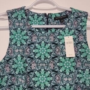 Banana Republic Sleeveless Dress in Black and Green Kaleidoscope Design with rounded collar and hidden zipper.