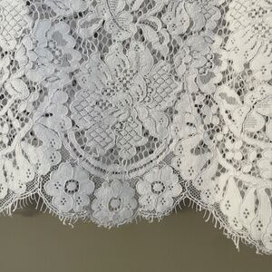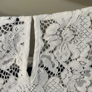 Gorgeous and feminine piece! Scalloped lace trim hem and cuffs, featuring bell 3/4 length sleeves. Eye and hook enclosure at back of the neck. Worn once; in pristine condition! Size Small Petite (but fits like a regular small).