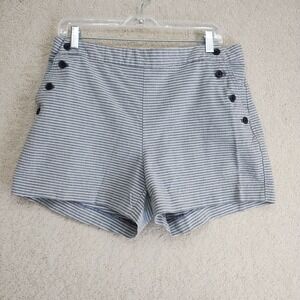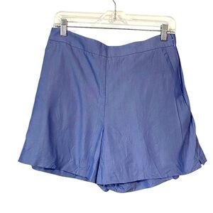 Gently worn blue linen shorts. Relaxed fit, pull on style. Pockets and elastic waist band on the back.