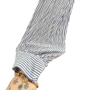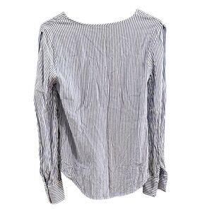 Add a touch of timeless style to your wardrobe with this Banana Republic long sleeve top! Featuring a classic blue and white stripe pattern, this top is both chic and comfortable. The slits on the arm areas and button-up cuffs add a unique design element, while the extra material in the arms ensures a relaxed and comfortable fit.