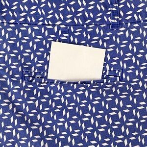 Women’s Size 4. Cotton/spandex. Blue print. Sewn cuffed hems with button tab accents. 5 pockets. Cross over two button close. Belt loops.