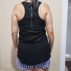 Cover Photo shows this same item in white -- layers do not show in photos of the black. Racerback. Mesh overlay with a silky lining -- so not an actual workout top! Long, meant to fall over the hips. Worn once.