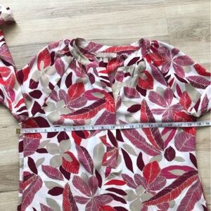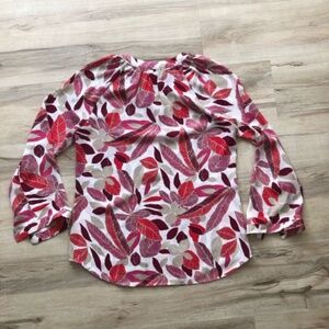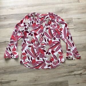 Elegant blouse with a multicolor leaf pattern. Features long sleeves and a comfortable fit. Ideal for versatile styling.