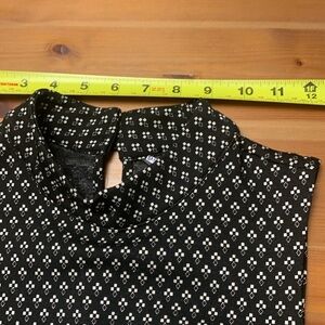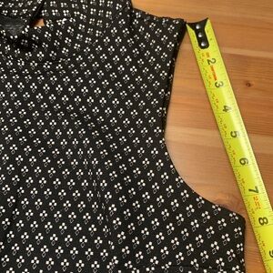 This top has a bit of weight to it so it would be good for a fall, winter and spring. It has a nice black-and-white pattern with black trim on the bottom.