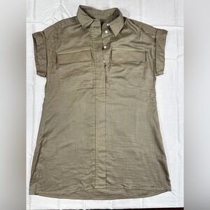 Chic olive shirt dress with button-up front. Features short sleeves and practical pockets.