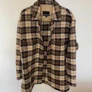 Oversized Italian Bouclé Shirt Jacket in Camel Plaid, in size S.