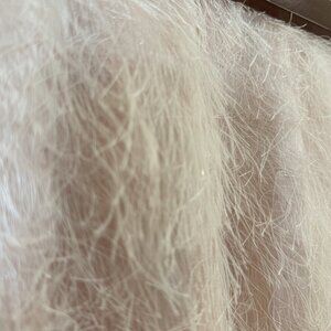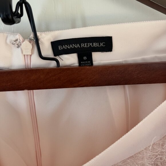This is a chic Banana Republic pencil skirt with a fun, textured design. The skirt is a soft blush or light pink color and features a fluffy, feathery texture, which adds a unique and playful element. It has a structured, flat waistband and is secured with a side zipper and hook-and-eye closure. The interior is fully lined for a smooth and comfortable fit. This skirt is a size 8. It's a versatile piece that could be a statement item for a night out or dressed down for a stylish, everyday look.