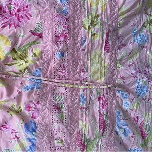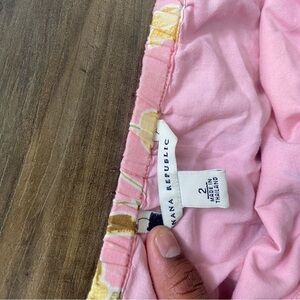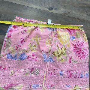 Charming pink midi skirt with vibrant floral patterns. Features a mix of blue, yellow, and green accents. Perfect for adding a pop of color.