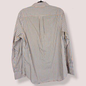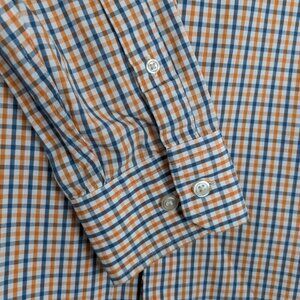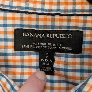 This long sleeve shirt by Banana Republic is made of 100% cotton and is marked as a "Non-iron slim fit". The fabric is white with a simple blue and orange plaid pattern. The shirt has buttoned cuffs, a standard collar and buttoned front. The bottom is also a little rounded. There is normal wear, but no issues affecting wearability.
