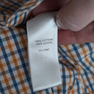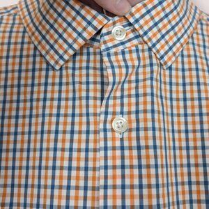 This long sleeve shirt by Banana Republic is made of 100% cotton and is marked as a "Non-iron slim fit". The fabric is white with a simple blue and orange plaid pattern. The shirt has buttoned cuffs, a standard collar and buttoned front. The bottom is also a little rounded. There is normal wear, but no issues affecting wearability.