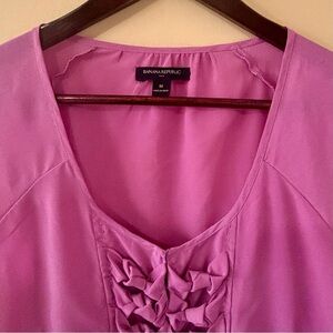 This pretty lilac top from Banana Republic features a stylish design with bows decorating the front neckline. Its soft fabric and flattering fit make it a must-have in your wardrobe. Size medium, 100% polyester. In good pre-owned condition, laundered and ready to wear.