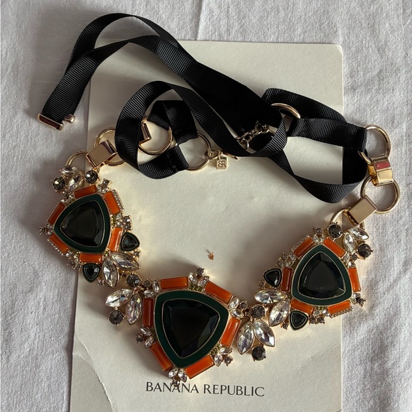 This is a Banana Republic Regalia statement necklace, featuring a vibrant design with blue, black, and coral-colored stones.The design is