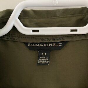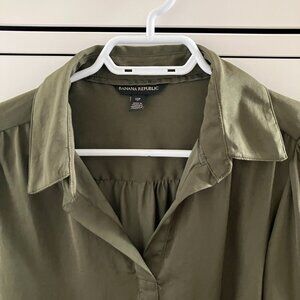 Olive green Banana Republic blouse with a sophisticated satiny look and open neckline (no buttons).