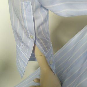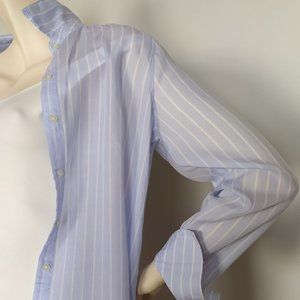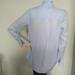 This sky blue, cut with ease oversized shirt has high slits at the sides to show off high-waisted styles. The perfect style when temperatures climb.