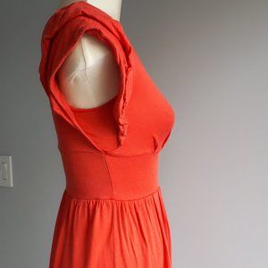 Banana Republic dress size XS. A gorgeous coral color (color is most accurate in the photo of the dress on myself). Fitted on top with swingy skirt.