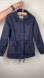 Elegant dark blue utility jacket with drawstring waist. Features front pockets and a high collar. Ideal for versatile styling and keeping the hood inside a zipper. Use it when windy or rainy, then convert it to a regular collar.