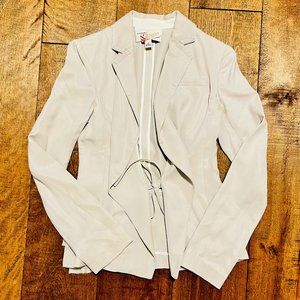 Banana Republic blazer made of soft, flowy fabric with two strings to tie at the front. There are unique pleated details at the back tail of the jacket that adds an extra layer of design. Size 0.