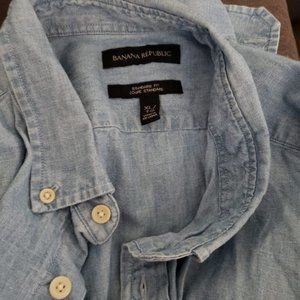 Worn once. Long sleeve, fairly lightweight. Perfect for cool summer nights. 100% cotton, one pocket on left side chest, extra buttons included. Light blue. Has the look and feel of a denim/chambray shirt.