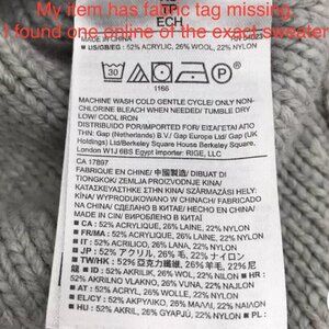 The yarn is a grey & cream color woven together. The fabric tag was ripped out of the sweater but I found on online to give you fabric content.