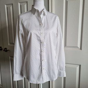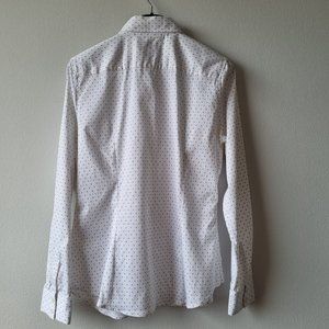 Crisp white button down shirt with tiny black pattern.