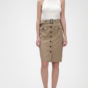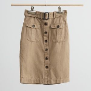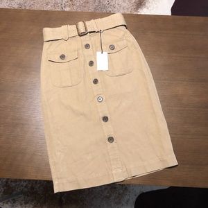 Stylish tan pencil skirt. Features button front and belt. Perfect for any occasion. The waist is 14” and the length is 25”.