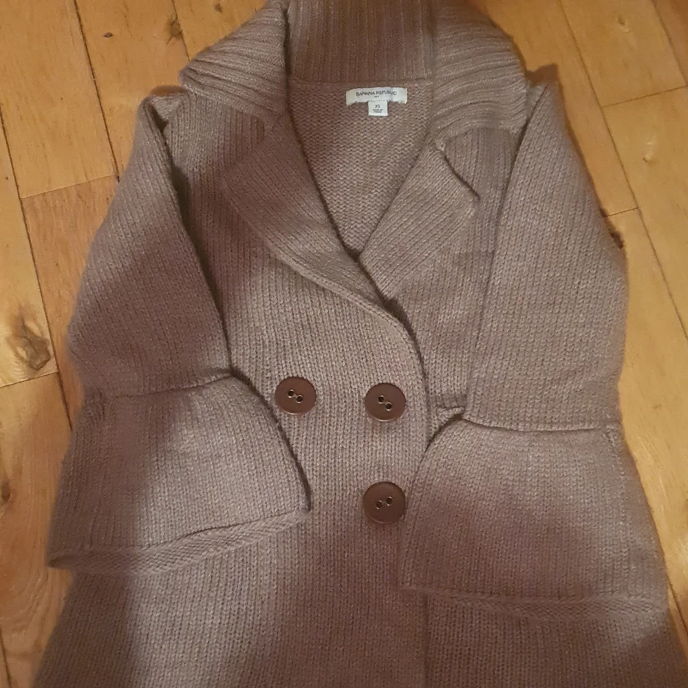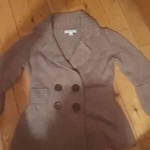 Soft knit coatigan with a shawl collar. Double-breasted front with large buttons. Long sleeves and patch pockets. Neutral taupe brown shade for versatile styling.