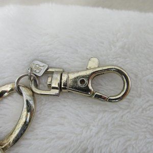 Short silvertone oval-link choker necklace with central rectangular goldtone focal point signed “BR” on square metal hang tag near clasp. It's chunky and all oval links are covered in tiny clear rhinestones on all sides. Also HEAVY.