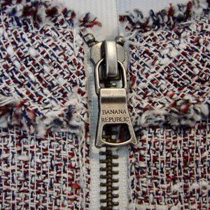 Banana Republic Tweed Linen Blend Jacket Blazer Fringe Collarless ~ Size 4 ~ 47% Cotton, 25% Polyester, 18% Acrylic, 10% Linen ~ Lining: 58% Acetate, 42% Rayon ~ Sleeve Lining: 100% Polyester