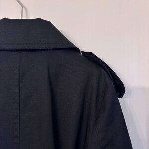 This trench coat features a slimmer, classic fit with shoulder epaulettes and storm flaps. Crafted from water-resistant fabric, it's designed for all-weather wear.