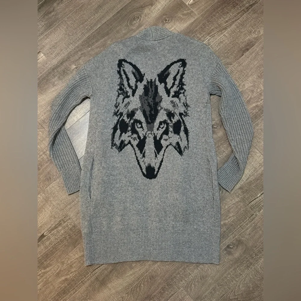 Banana Republic long grey cardigan with a wolf face knitted on the back. Only worn twice. In excellent condition.