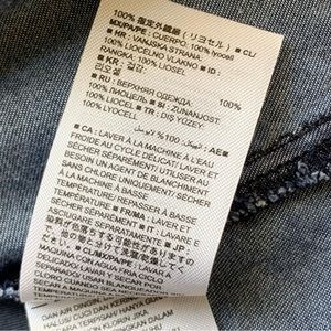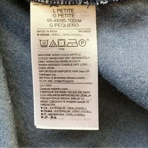 100% Lyocell, aka Tencel. Features a longer length, tie cuffs, and a collar.