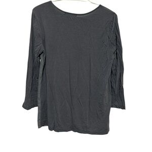 Dark grey, three-quarter sleeve blouse. Small keyhole neckline. Relaxed fit. Size small.