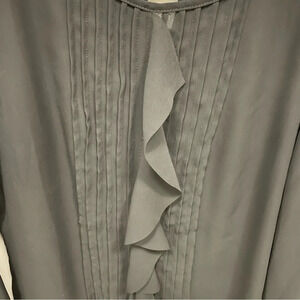 Black ruffle blouse in a women’s small by Banana Republic. Dress it up with a skirt or dress pants, but also pairs well with a cute pair of jeans.