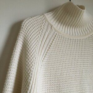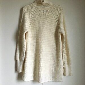 Very good preowned condition, cream coloured, oversized, turtleneck, wool blend pullover sweater with a side slit by Banana Republic. It's a very subtle off-white/cream. Has a drop tail hem and is slightly longer in the back than the front. Gorgeous, modern, chic piece that's a perfect staple for all those cool months in Canada.