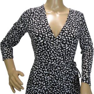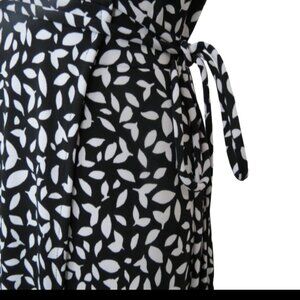 This long sleeve, below the knee, white leaf pattern wrap dress from Banana Republic features a classic design with a flattering wrap silhouette that cinches at the waist. Crafted from high-quality fabric, it offers both comfort and style. With its understated yet chic aesthetic, this dress effortlessly transitions from day to night, making it a staple piece for any wardrobe. Whether paired with heels for a polished office look or dressed down with sandals for a casual outing, the Banana Republic wrap dress is a versatile and sophisticated choice for any occasion.