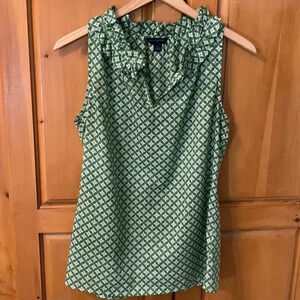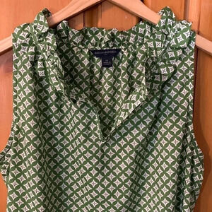 Pretty pea green and white diamond patterned. Sleeveless. High neck with V in front. Ruffle around neck collar. Light. Has stretch. Size XS.