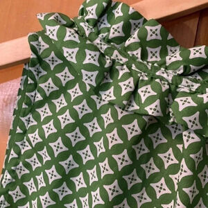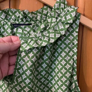 Pretty pea green and white diamond patterned. Sleeveless. High neck with V in front. Ruffle around neck collar. Light. Has stretch. Size XS.