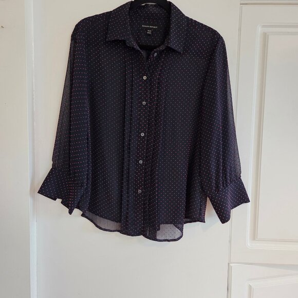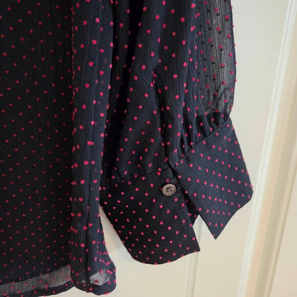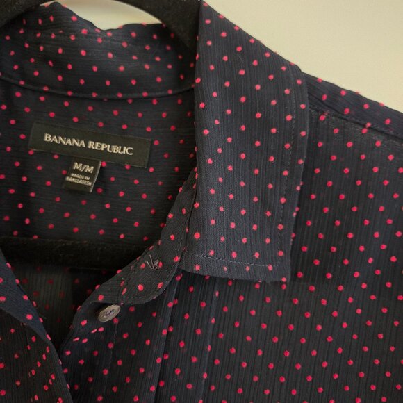 Banana Republic blouse made from a lightweight, semi-sheer fabric, in a deep navy base adorned with tiny dotted patterns in a fushia contrasting color. It features a classic collared neckline, full button-down front, and flowy mid sleeves with gathered cuffs and a slight balloon.The hem is slightly rounded, allowing for versatile styling options — tucked in, half-tucked, or worn loose.