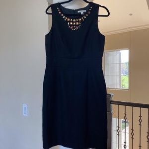 Wool blend black dress with crystal accents. Round neck with concealed back zip closure.