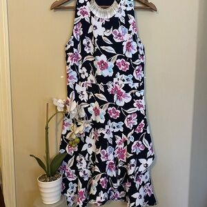 Banana Republic dress. Floral navy and pink. Ruffle at hem.